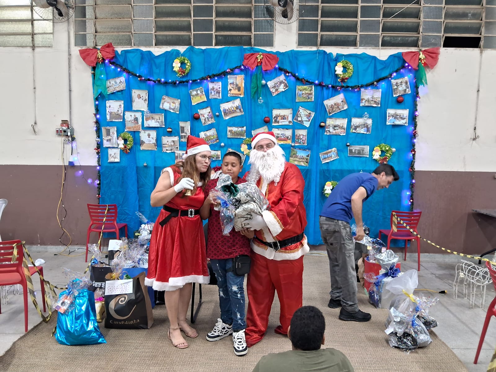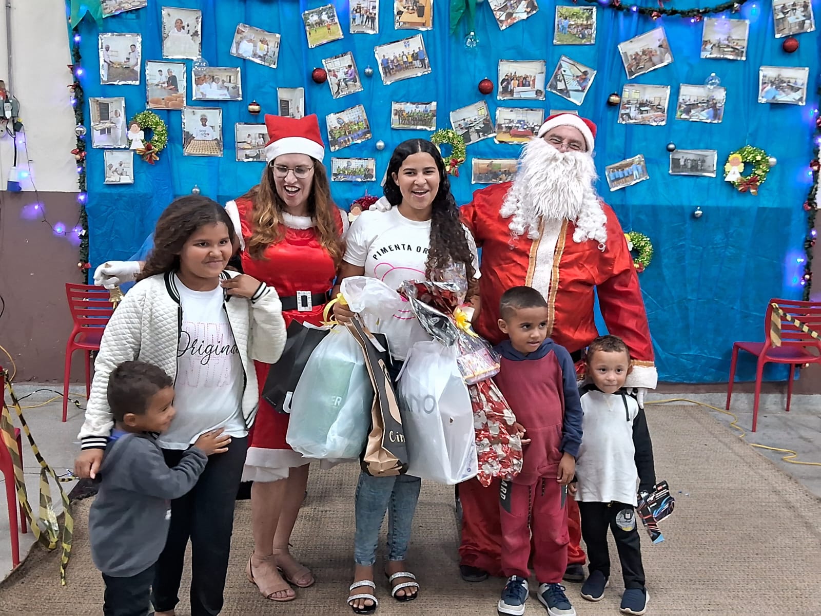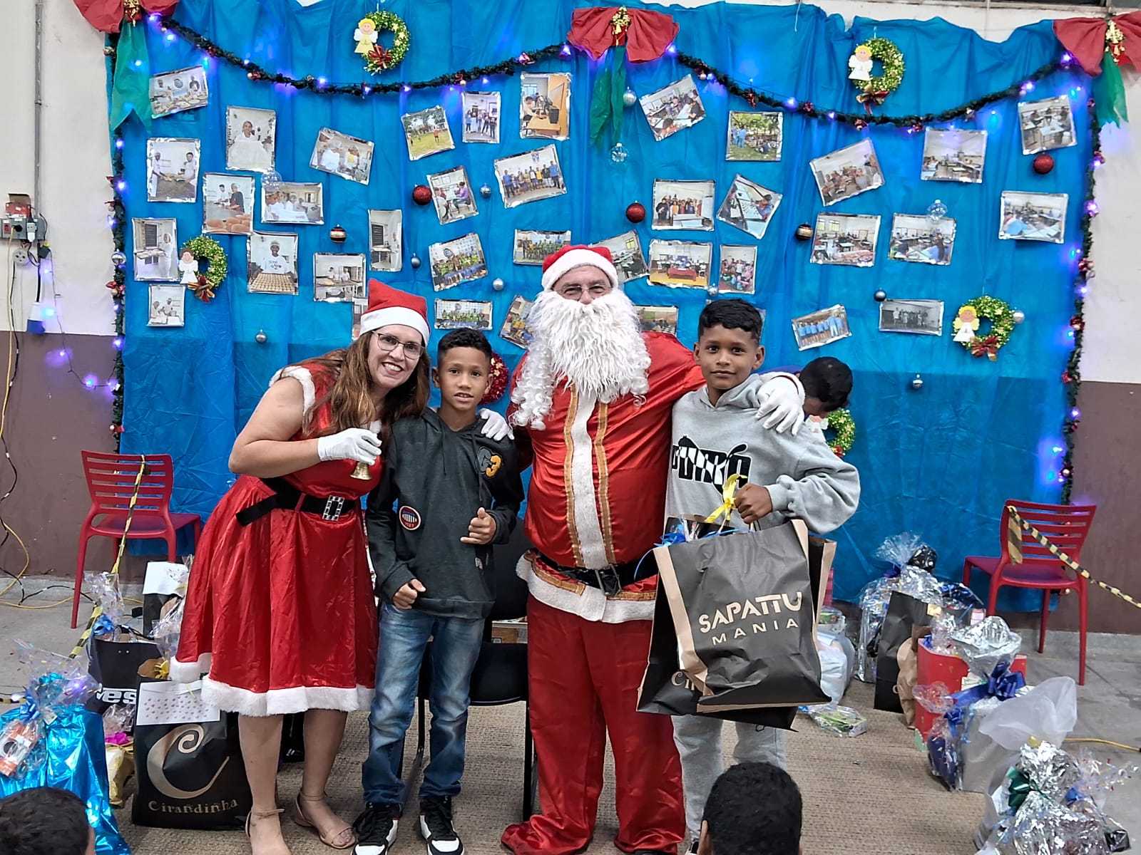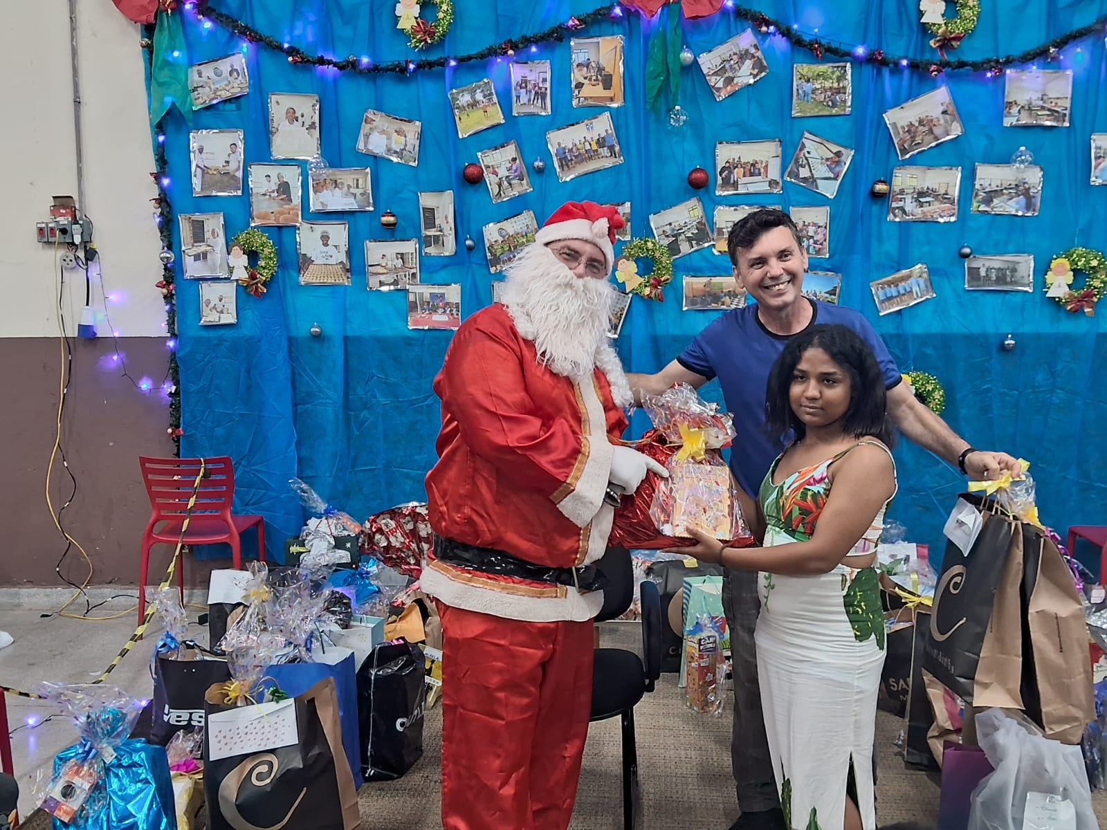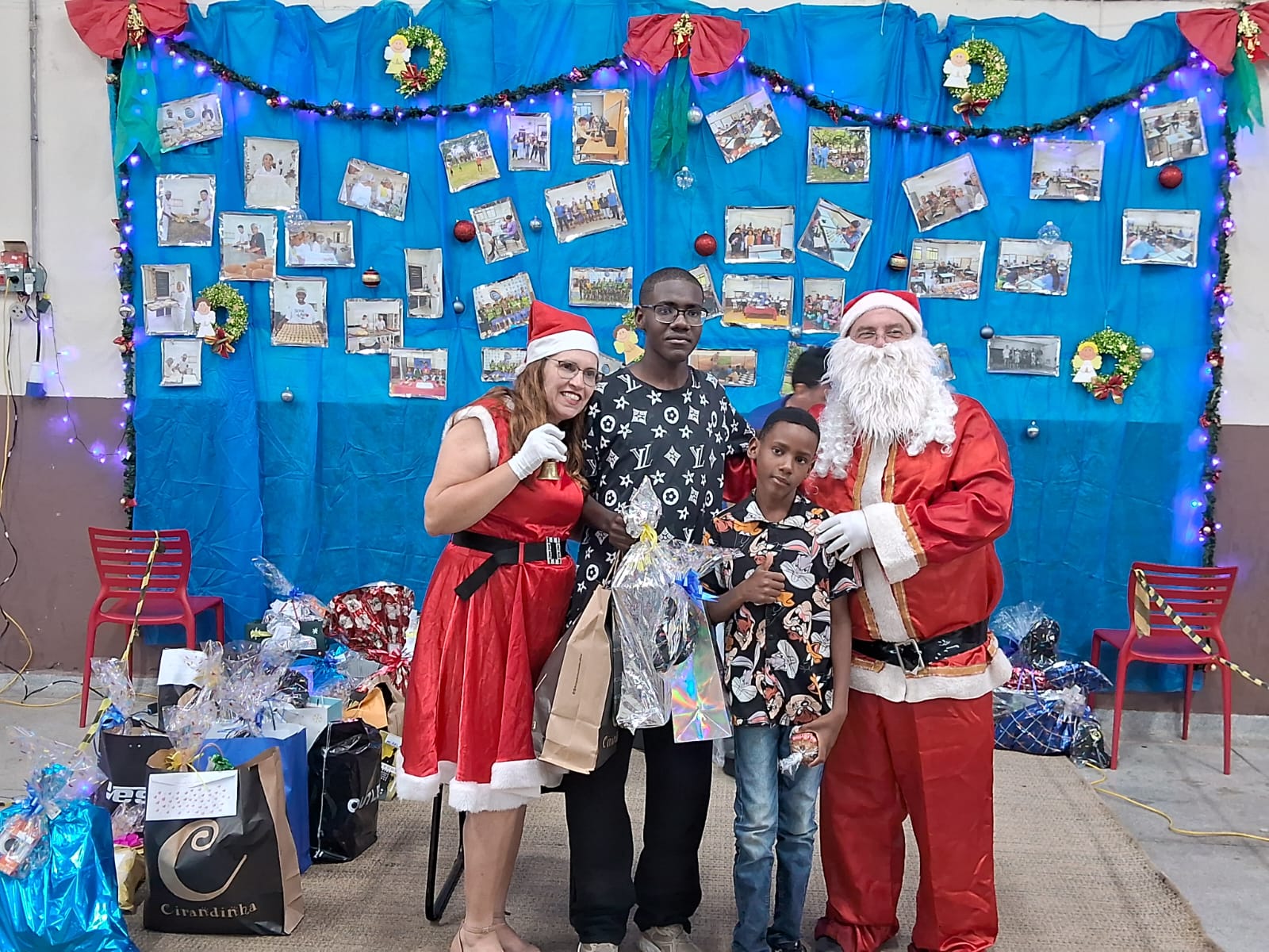 Também precisamos destacar a ajuda fundamental de nossos parceiros e amigos, que nos auxiliaram na cozinha, na organização do salão e na chegada do Papai Noel. Aliás, foram vários, e vieram especialmente para promover a entrega dos presentes de Natal a todos os alunos e também aos seus irmãos de até 12 anos. No mês de outubro, todos escreveram suas cartinhas, que mais uma vez foram acolhidas rapidamente por madrinhas e padrinhos de toda a comunidade de Marília, trazendo ainda mais alegria para essa festa tão abençoada.